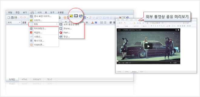이미지, 플래시, 동영상, iframe을 세부적인 옵션(설정)으로 목적에 맞게 객체를 삽입할 수 있습니다.